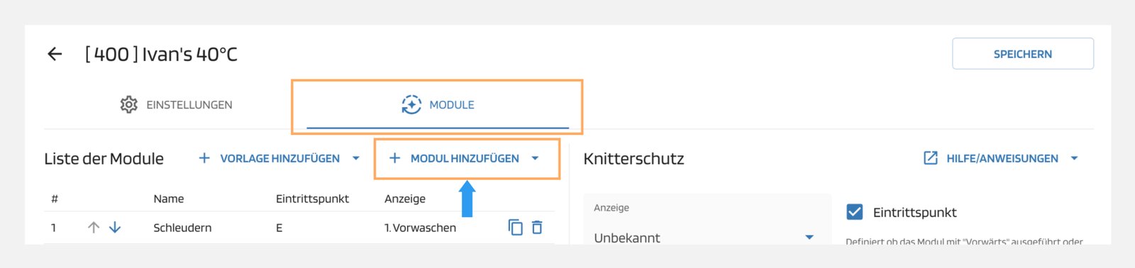 Unter der Registerkarte "Module" können Sie Module für Ihr individuelles Programm hinzufügen.