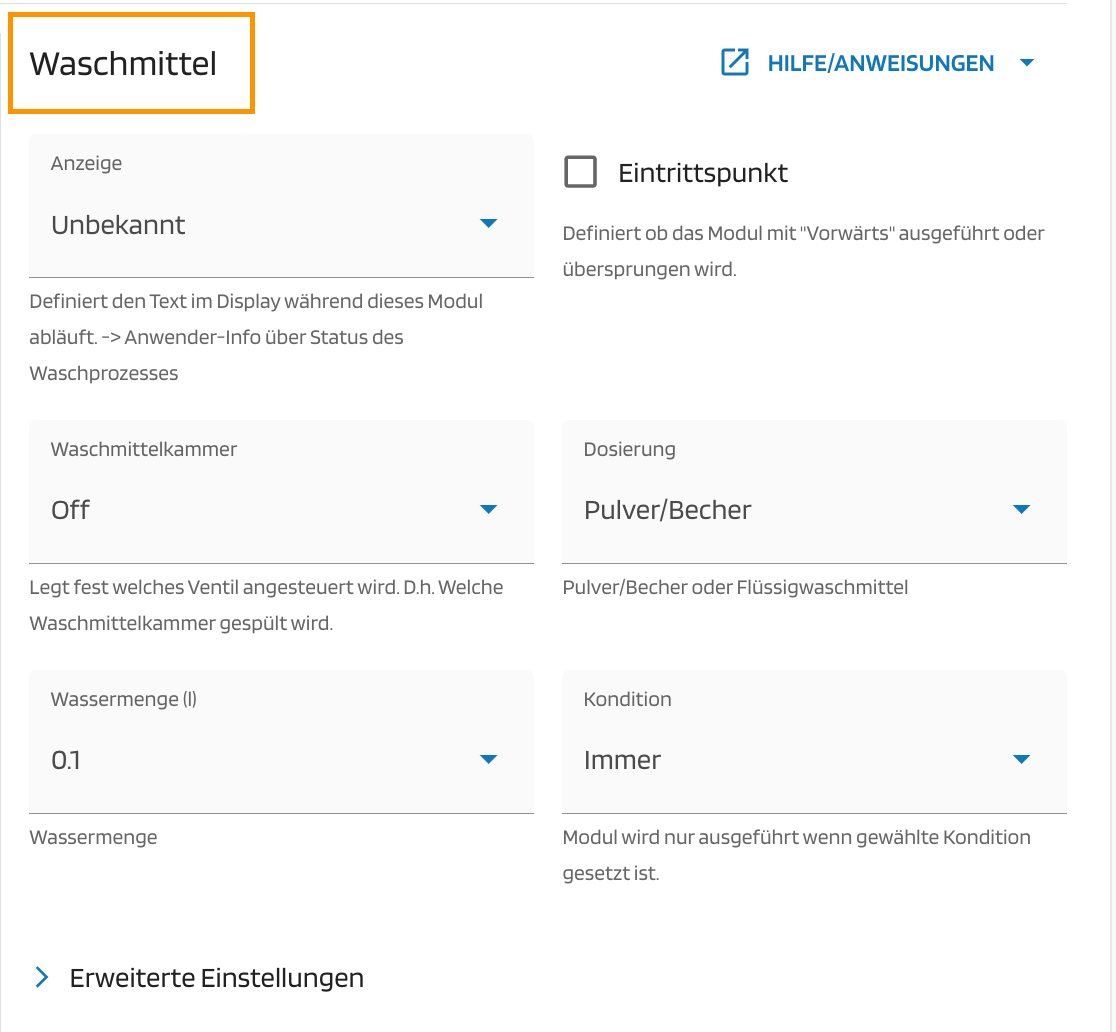 | Dosierung | K.A. | Bei der Dosierung ist diese Einstellung auf Pulver zu setzen. Somit kann die Waschmitteleingabe verwendet werden. | Pulver |