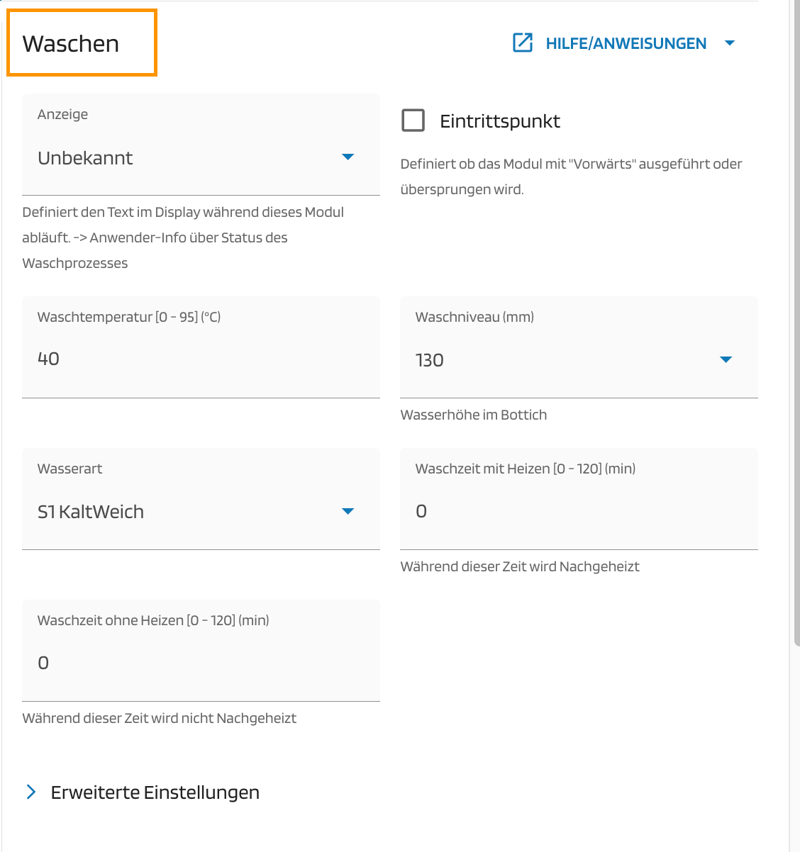 | Waschzeit ohne Heizen [0 - 120min] | K.A. | Die "Waschzeit ohne Heizen" umfasst die Waschzeit nach Erreichen der Soll-Waschtemperatur. Während dieser Zeit wird nicht nachgeheizt, auch wenn die Temperatur unter einen gewissen Hysteresewert fällt. Die Funktion schliesst immer an die Funktion "Waschzeit mit Heizen" an. | 0min |