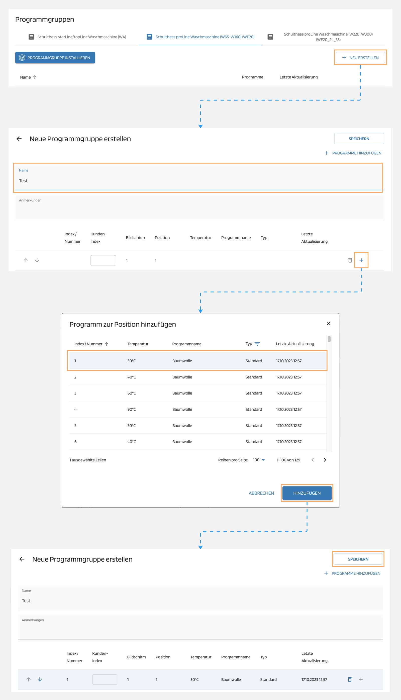 In der Proficlean-Programmauswahl können Sie ein individuelles oder Standardprogramm an eine beliebige Stelle des Bildschirms setzen. Es stehen Ihnen 24 Programmplätze zur Verfügung. Um das gewünschte Programm hinzuzufügen, klicken Sie auf das Plus-/Hinzufügen-Symbol an der entsprechenden Stelle. Um ein Programm zu entfernen, klicken Sie auf das Papierkorbsymbol. Mit den Pfeilen können Sie Programme nach oben oder unten verschieben. Sie können Ihrem Programm auch einen Kundenindex zuweisen, der beim Laden in die Maschine in den Programmnamen eingefügt wird.