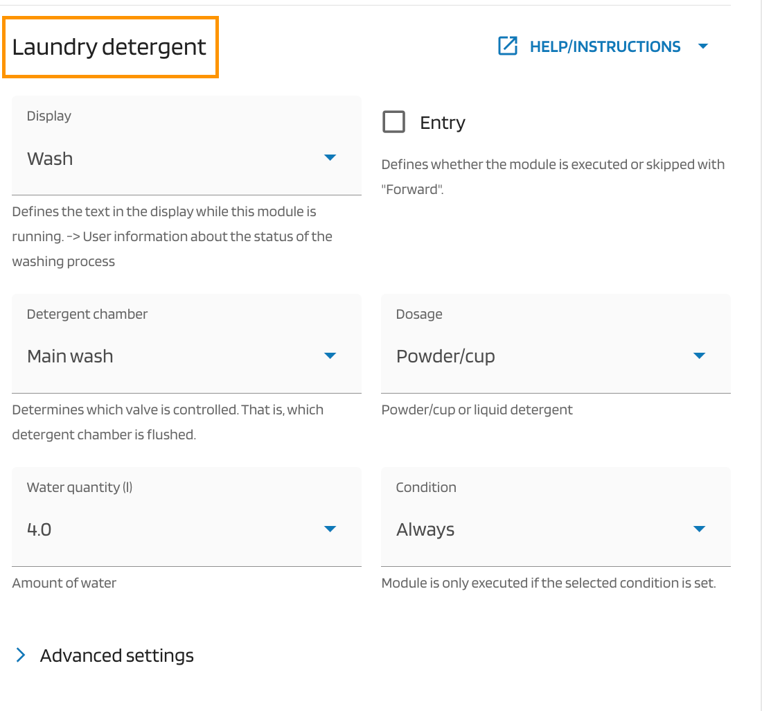 | Dosage | N/A | For dosing, this setting should be set to powder. For this, the laundry detergent dispenser can be used. | Powder |