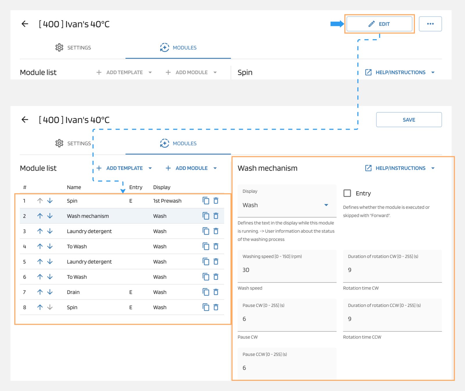 Under the "Modules" tab, you can enable the Edit Mode for all listed modules by clicking on the "Edit" button, you can modify the settings of each module.