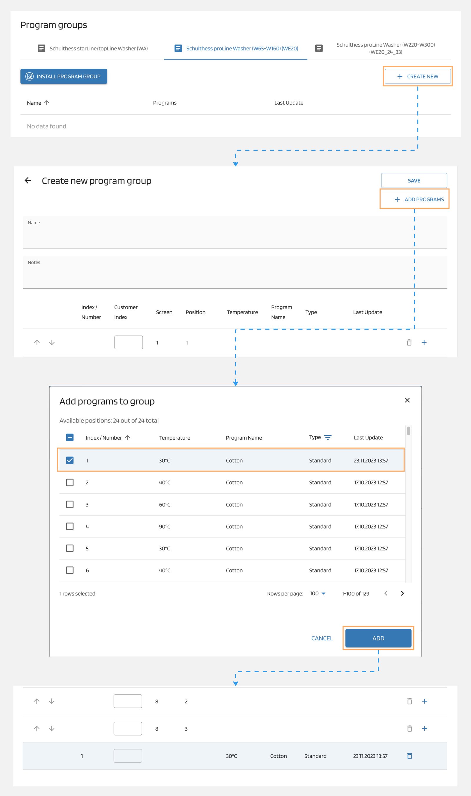 If you need to set liquid detergent dosage settings for standard programs, you don't have to assign them a specific screen position. Simply use the "Add Programs" icon located in the top right corner to select one or multiple standard programs. These selected programs will be added to the bottom of the list without any assigned screen position.
