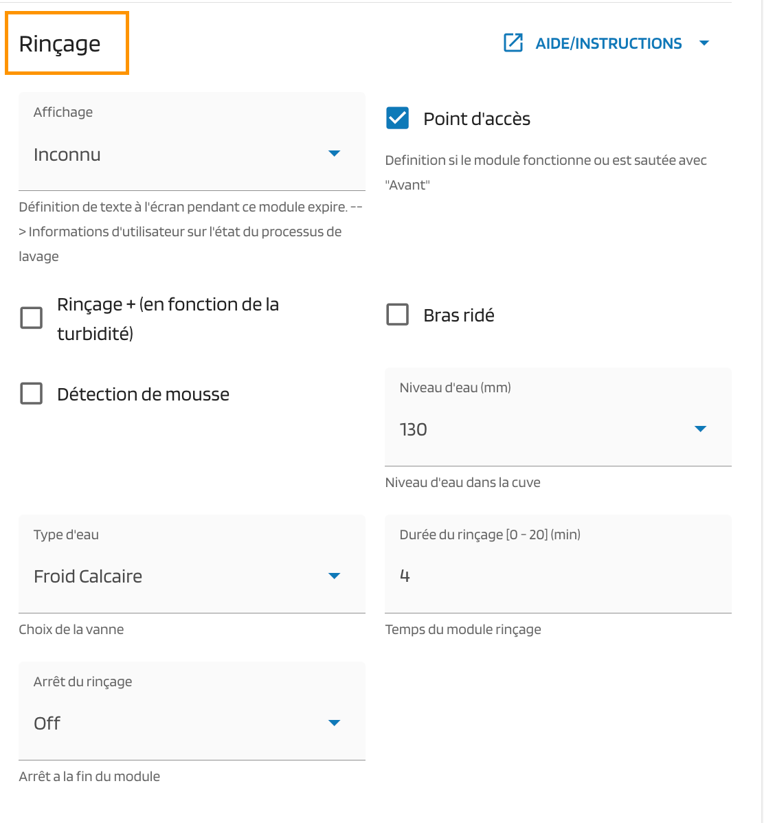| Durée du rinçage [0 - 20min] | N/A | Temps global du cycle de rinçage, injection d’eau incluse. | 4min |